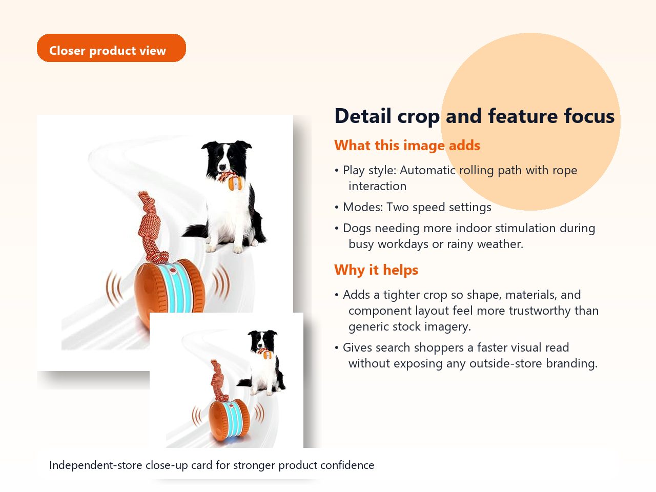 • Motion activation re-engages dogs after short pauses, extending solo play time.