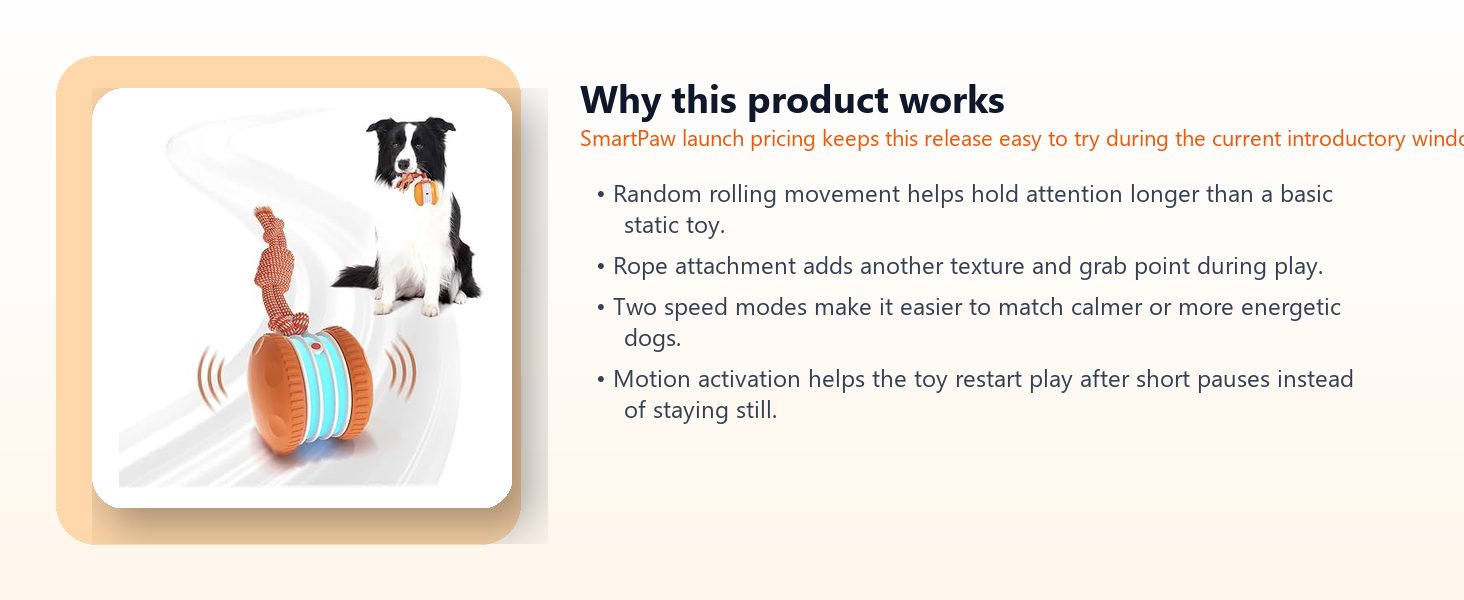 SmartPaw selected it because it gives the enrichment category another strong search-friendly option: an automatic motion toy that feels more active than a plush and more approachable than a harder puzzle board.