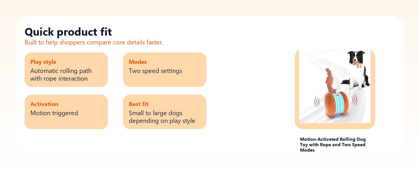 A motion-activated rolling dog toy with rope attachment and two speed modes for indoor boredom relief and solo play.