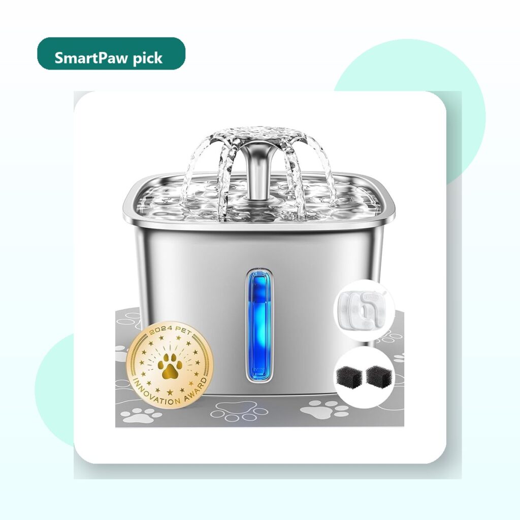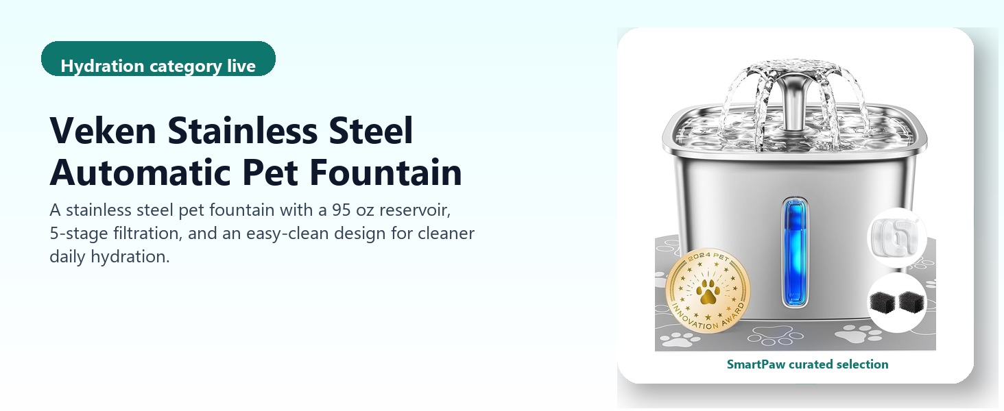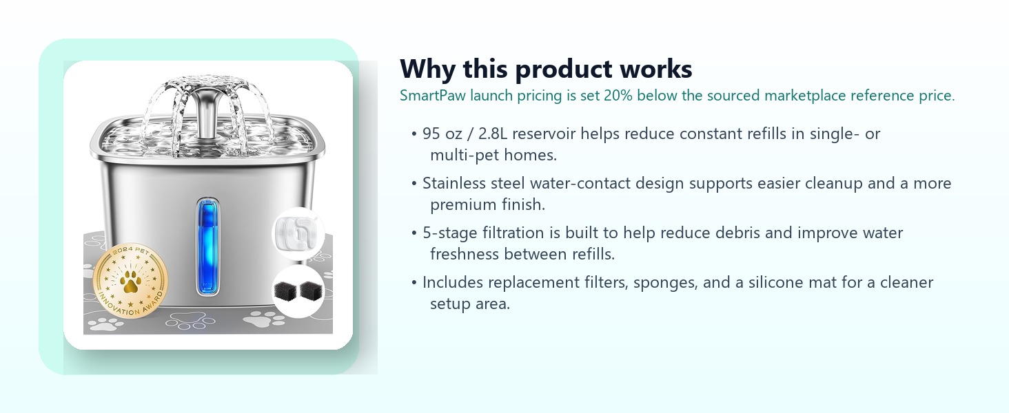 SmartPaw selected this fountain because the stainless steel drinking surface, larger water reserve, and replacement-filter bundle create a stronger entry option for households that want to improve everyday water intake and maintenance.