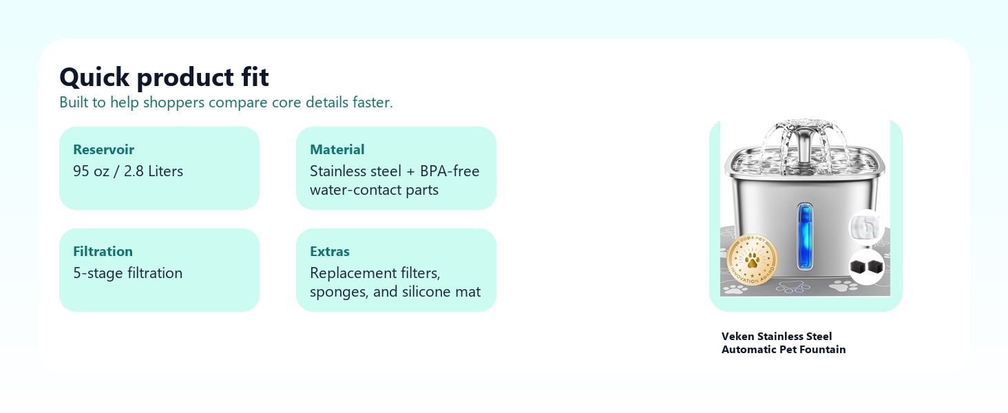 - Small and medium pet households that want a cleaner shared hydration station.